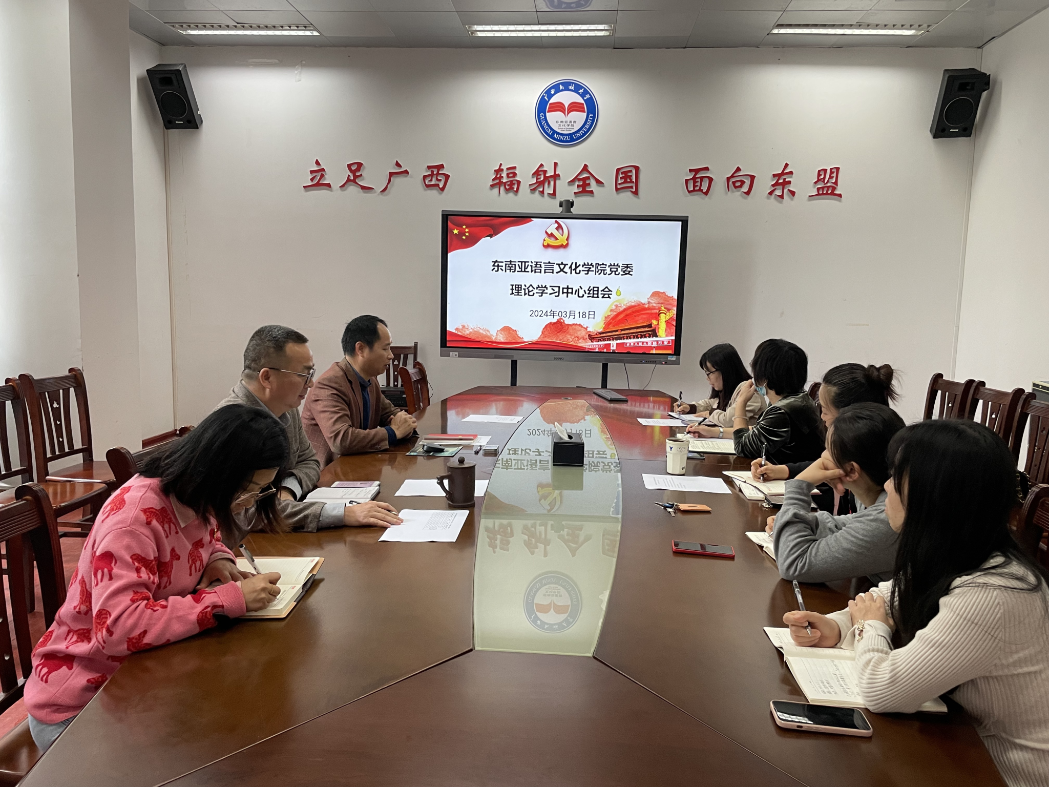 3月18日下午,m88明昇党委在东盟主楼118会议室召开理论学习中心组学习(扩大)会第2次会议,学习贯彻习近平在参加江苏代表团审议时重要讲话精神。学院党委委员、纪委委员、党支部书记以及教师参加会议,会议由党委书记何波主持。