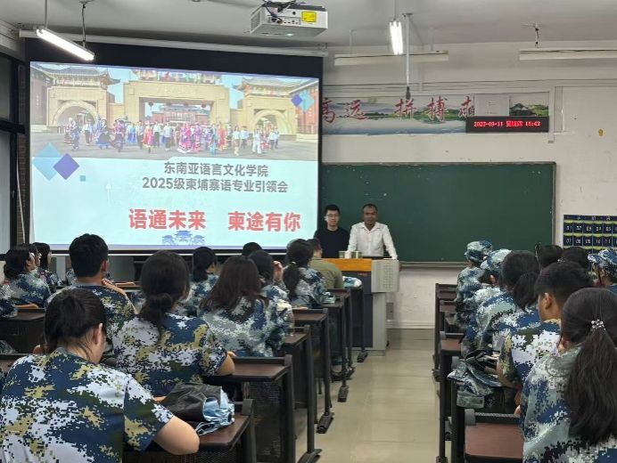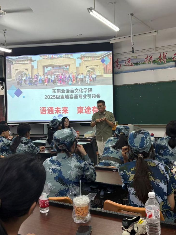 会议上,柬埔寨语系主任韦柳宇向新生作专业介绍。她立足专业定位和发展,结合柬埔寨语专业的学科特色与师资构成,重点解读人才培养目标、课程体系及学分修读要求,并基于历年就业数据分析毕业去向趋势,包括公务员招考、研究生升学、国外就业等多元发展路径。同时,通过展示往届生实习实践成果体现学子专业风采,结合东南亚非通用语种教学特色和国际化培养模式剖析专业优势,全面深化新生认知。此外,韦柳宇还专门说明奖助学金的申请事宜,并解析出国交流期间的费用问题与支持政策,回应了新生的实际关切。